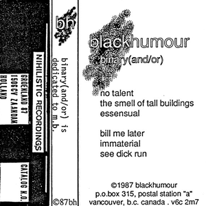 The blackhumour audio project had its beginnings in early 1982 with the first few experiments I was doing on my teac 4-track reel-to-reel recorder. The resulting early pieces were not so good, but some of the pieces which were done with my then audio-partner, somebody else, were successful. Two of these pieces, 'murder', and 'trade and commerce', are included in the retrospective of early bh work, 'radical positive' (banned productions). This release also shows the evolution of the blackhumour approach away from treatment/effects techniques of any kind, such as equalization, reverberation. Flanging, echo, etc., and the choice made by blackhumour to use as its sole sound-construction source the use of 'found-object' human voice only, with the exclusion of such tape techniques as speed-masking (speeding up or slowing down the sound of the voice) or back-masking (the notorious technique of playing the voices backwards). Since 'snakes in an atheist's grave' (1984), NO blackhumour piece has used anything other than found object (spoken) human voice and editing techniques. (since 1986, digital editing has been included, thanks to inexpensive digital sampling.) I wanted the sound source to be absolutely basic. The human voice speaking was about as basic as i could get. The rationale being that we are constantly hearing speech, whether it is from others, or simply the sound of our own voices in our ears. Read more on Last.fm. User-contributed text is available under the Creative Commons By-SA License; additional terms may apply.